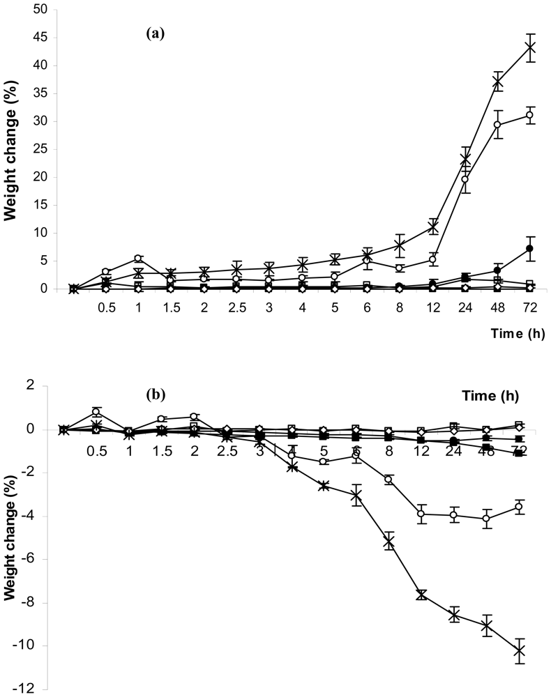 At steady state, potassium sulfate and potassium acetate in desiccators provided a relative humidity of 96.1 ± 1.5% and 22.4 ± 1.3% at 30 °C, respectively. Figure 2 shows the percentage weight change of each dressing after being placed into the desiccators at a relative humidity of 96.1% (Figure 2a) and 22.4% (Figure 2b), respectively for 0.5 to 72 h. Acticoat®, Bactigras®, Mepitel® and Urgotul SSD® absorbed or released very little moisture from the dressing at any humidity, whereas Askina Calgitrol Ag® absorbed and released the most moisture in humid conditions. After being placed in high humidity, Askina Calgitrol Ag® started to absorb moisture within 30 min and showed a significant weight change after 12 h. It also absorbed moisture close to 50% of its initial weight after being placed in a high humidity environment for 72 h and still did not reach a saturated condition. Nevertheless, it started to release moisture after placing it in a low humidity environment for 3 h and released approximately 10% of its weight after 72 h. In addition to Askina Calgitrol Ag®, Aquacel Ag® also showed a good absorption of moisture and had moisture release properties but to lower degree. Aquacel Ag® absorbed moisture up to 30% of its weight after 72 h in a high humidity environment after which it started to reach its saturated condition, whereas it showed approximately 4% moisture release after placing it in a low humidity environment for 72 h.