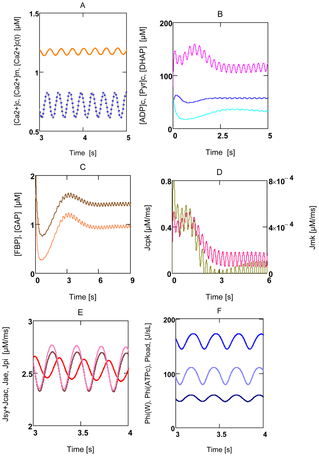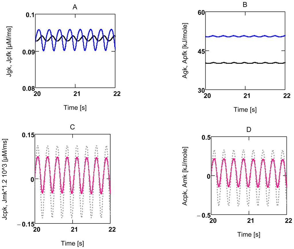 In Figure 1 the behavior of flux equations is demonstrated for conditions of [Ca2+]c induced forced oscillations (see Section 2.3.2). At high A’s (panels A and B), flux oscillations are brought about mainly by activation factors, whereas at near zero driving forces, flux oscillations follow the oscillations of respective A’s about zero. The Second Law of Thermodynamics demands that the reaction rate of a spontaneously proceeding reaction goes against zero continuously. The oscillations about zero (Figure 1) do not violate this law, because these oscillations of the driving force are forced by the oscillating sarcosolic/cytosolic ADP concentration ([ADP]c).