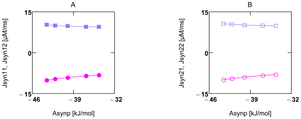 The great advantage of flux equations containing both variable conductances as well as variable affinities, is that they are remarkably well-suited for metabolic network modeling. So flux control by activating or inhibiting effectors is made possible as it is known from enzyme kinetics []. The inclusion of driving forces has the advantage that energetic parameters like power output or efficiency of coupled processes as they occur in metabolic pathways can be calculated.
