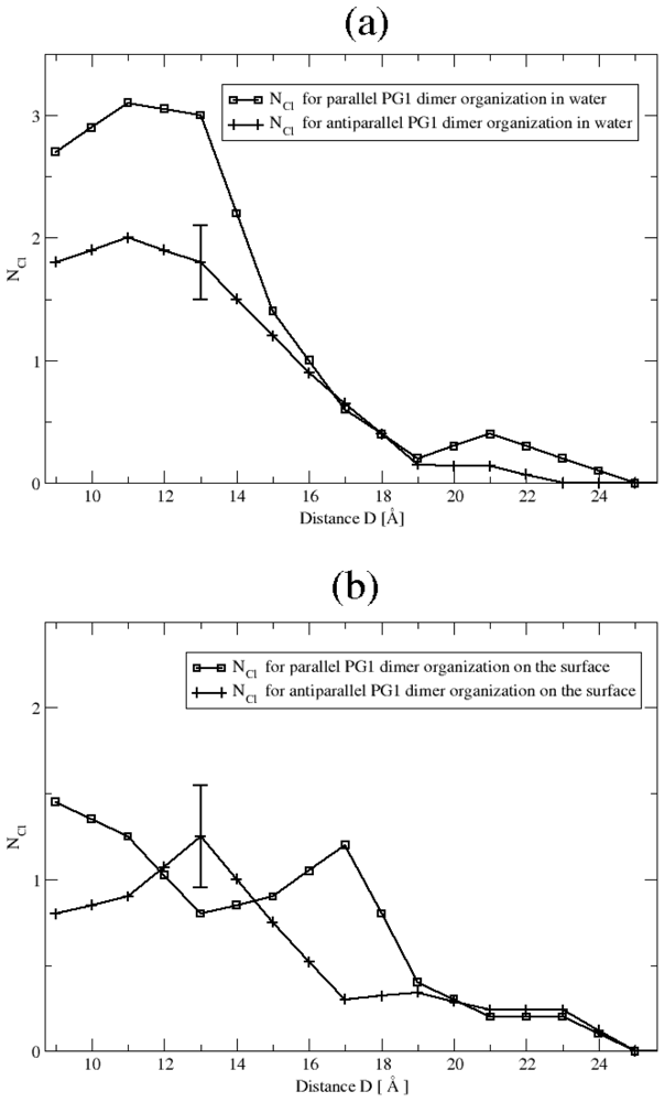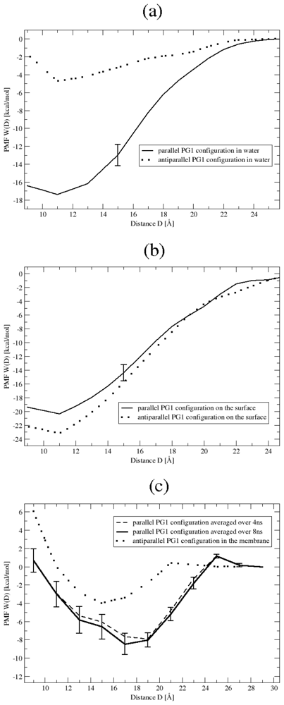 - The two peptides are positioned in either the parallel or antiparallel orientation, at a distance D. The peptide separation, D, ranges from 9 Å to 25 Å in increments of 2 Å. There are thus 54 systems constructed (two orientations, three environments, nine separation distances). We should note that for PG1pd in Environment 3, we added another separation distance of D = 27 Å, in order to ascertain that the PMF attains a plateau at long distances, as discussed in more detail in Section 3. Each of the 55 constructed system is then equilibrated over 4 ns in the NPT ensemble. During this equilibration the PG1 peptides are restrained using harmonic springs with a a force constant 20 (kcal/mol)/Å2 applied to all peptide backbone atoms.
