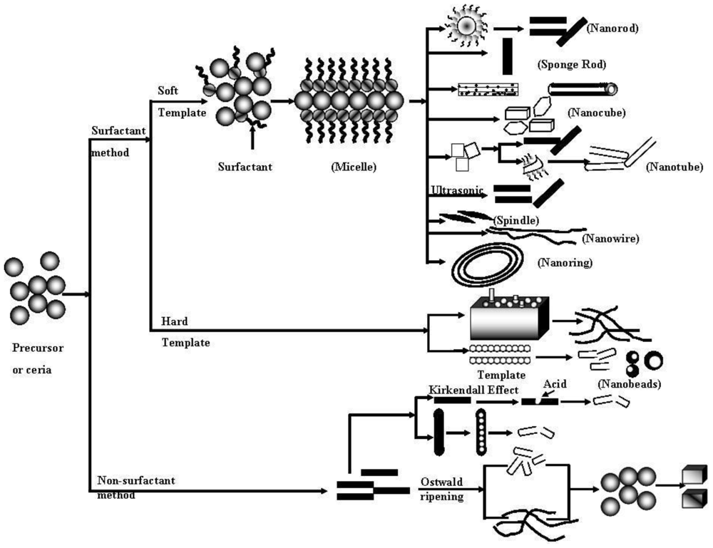 Surfactant plays an important role in the preparation of ceria nanostructure. The reaction of cerium salts (either chloride or nitrate) under basic conditions with ammonia at room temperature results in the precipitation of gelatinous, hydrous cerium oxide. If the reaction is conducted in the presence of the “soft template” as cationic surfactants (i.e., alkyltrimethylammonium salts, CTAB, octadcylamine or ethylenediamine (C2H4(NH2)2)), hydrous cerium oxide can incorporate the organic molecule by exchange with surface OH− groups. This approach follows the observation that hydrous oxides can exchange either cations or anions, depending on the pH of the medium [19,46]. If the pH is higher than that of the isoelectric point of hydrous cerium oxide (6.75–8, depending on the environment) then incorporation of cationic surfactants takes place. The size and shape of the 1-D nanostructure is greatly influenced through the reaction time, reaction temperature and surfactant/Ce3+ ratio in the initial solution [5,17–23,46–47].