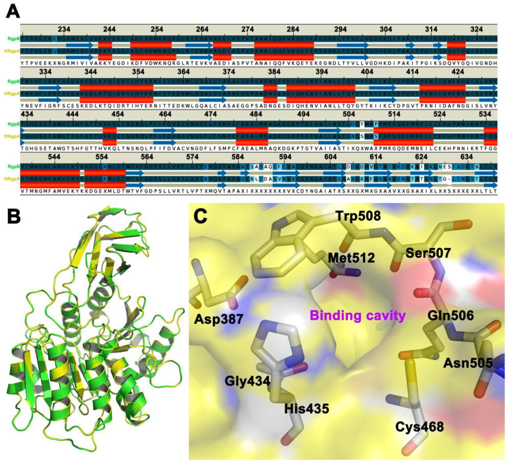 Panel A shows the sequence alignment of the amino acid sequences of the selected region of HRgpA and the secondary structure alignment. Panel B shows the three-dimensional homology model of HRgpA (yellow color) superimposed on the RgpB (green color) crystal structure [] that was used as a template. The color coding follows that of the gene name in Panel A. The side chains of the residues proposed to be involved in inhibitor binding are shown as sticks in Panel C.