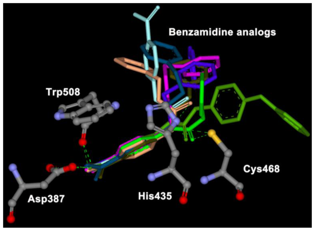 Each docking simulation generated 100 docked conformations of each inhibitor. The docking procedure generally generated slightly more diverse docking poses for the inhibitors containing urea or ether linkers. Encouragingly, out of these 800 poses generated, only a handful fall outside of a consensus orientation in which the benzamidine part of the inhibitor is positioned in the binding cavity of the HRgpA, which is in close proximity to Asp387, His435, Cys468, and Trp508 (Figure 2). In these poses, one of the substituents (generally the largest one) points towards the outside of its cavity.
