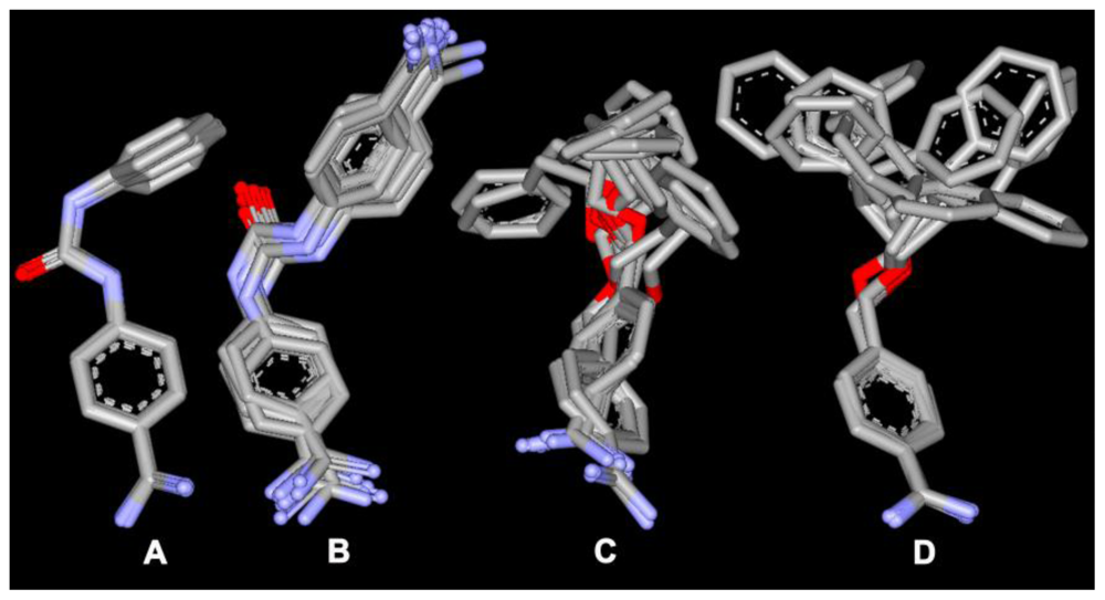 Top 10 docking solutions for inhibitors: (A) Bz1; (B) Bz4; (C) Bz6 and (D) Bz7. The average heavy atom RMSD relative to the top-ranked pose is less than 3.0 Å.