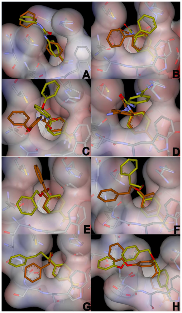 Representative binding poses of eight benzamidine analogs in core binding sites given by the docking calculation.