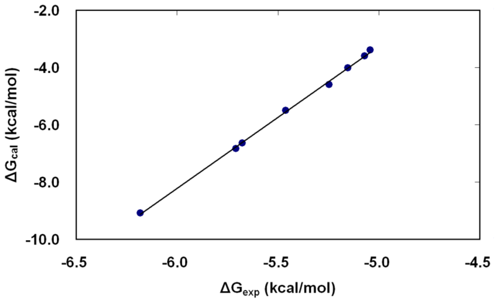 The correlation between the free energies of binding of inhibitors (Bz1–Bz8) as calculated by molecular dynamics in combination with the PB-SASA method (ΔGcal from calculation) versus those derived from the experimental data of Krauser et al. (ΔGexp from experiment) []. The lowest binding free energy estimate from the five different poses simulated for each inhibitor is plotted against the corresponding value calculated from experimentally determined Ki-values.