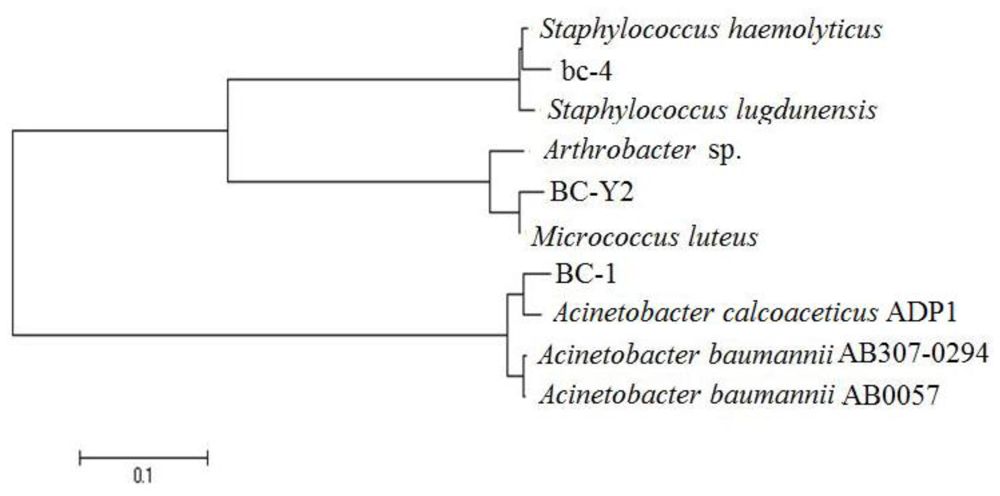 Three strains (labeled as BC-Y2, bc-4 and BC-1) were isolated from the buccal tubes. Six buccal tubes were found to be contaminated by bacteria. No bacteria were isolated from saline without the buccal tubes (data not shown). Based on 16S rRNA genes phylogenetic analyses, the identities of these bacterial strains (BC-Y2, bc-4 and BC-1) are: Micrococcus luteus, Staphylococcus haemolyticus and Acinetobacter calcoaceticus, respectively (Figure 1). The16S rRNA genes sequences for BC-Y2, bc-4 and BC-1 have been deposited in GenBank with the following accession numbers: GU370962, GU300765 and GU370964, respectively.