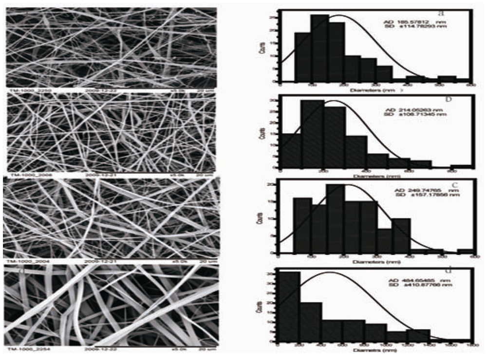 The morphologies were observed with a scanning electronic microscopy (SEM; TM-1000) at an accelerated voltage of 15 kV. The mean fiber diameters were estimated using image analysis software (Image-J, National institutes of Health, U.S.) and calculated by selecting 100 fibers randomly observed on the SEM image.