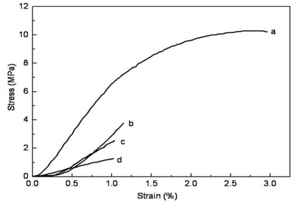 Tensile stress-strain curves of cross-linked CS/SF composite membranes with various chitosan contents. (a) 0%; (b) 20%; (c) 50%; (d) 80%.
