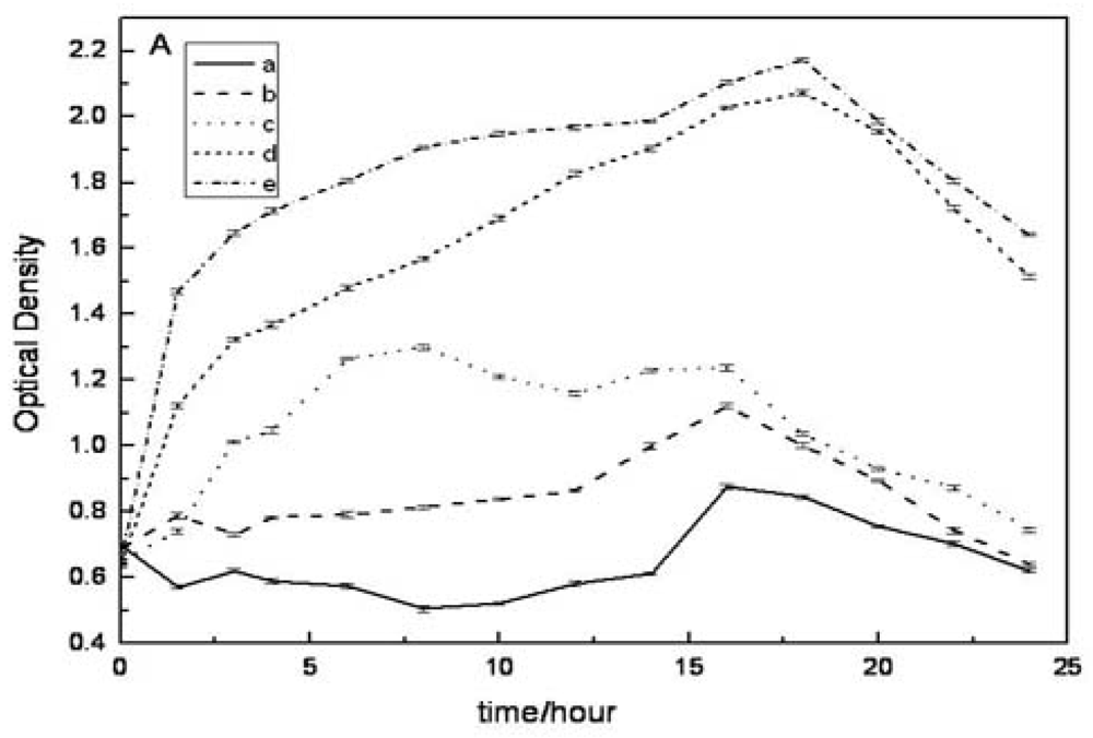 Growth curves of E. coli and S. aureus in the presence of CS/SF as measured at 570 nm. (A) E. coli; (B) S. aureus (a) CS/SF (80/20); (b) CS/SF (50/50); (c) CS/SF(20/80); (d) pure SF; (e) control growth.