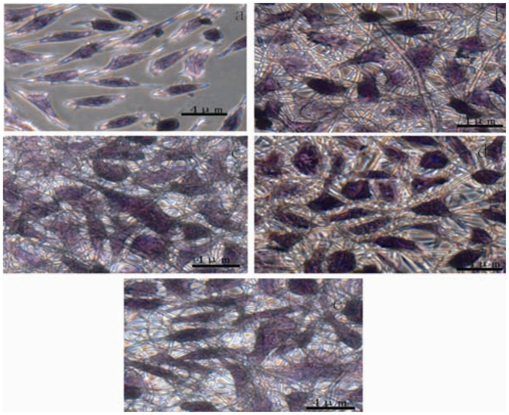 Comparison of fibroblasts proliferation on electrospun silk fibroin–chitosan nanofibers and controls: (a) glass cover slips; (b) CS/SF (80/20); (c) CS/SF (50/50); (d) CS/SF(20/80); (e) pure SF. (H&E Staining, ×400 light microscope).