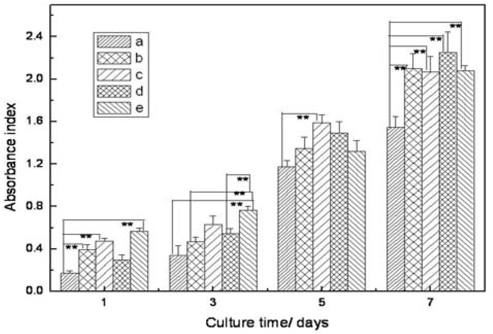 Comparison of fibroblasts proliferation on electrospun silk fibroin–chitosan nanofibers and controls: (a) glass cover slips; (b) CS/SF (80/20); (c) CS/SF (50/50); (d) CS/SF (20/80); (e) pure SF. Error bars represent mean ± SD for n = 3. **p < 0.01.