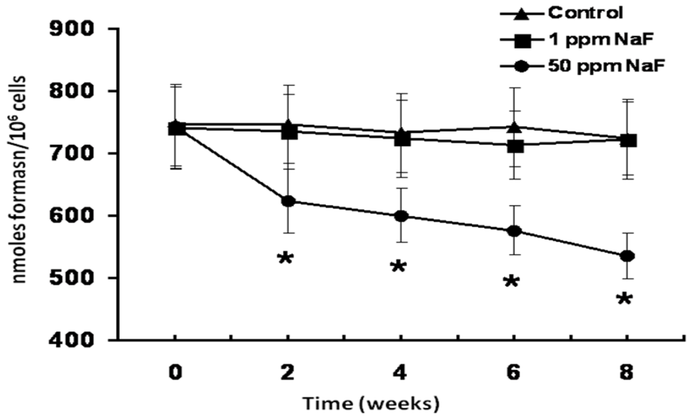 Figure 1 shows a time course of the changes in the metabolic activity of the rat leukocytes treated with 1 or 50 ppm of NaF. As can be noted, in comparison with the control group, rats that received the 1-ppm dose of NaF did not produce significant changes in their metabolic activity. In contrast, the 50-ppm dose produced a significant decrease (p < 0.05) in this parameter from 2 weeks of treatment and the metabolic activity diminished by ca. 20% (p < 0.05) after 8 weeks of treatment (Figure 1).