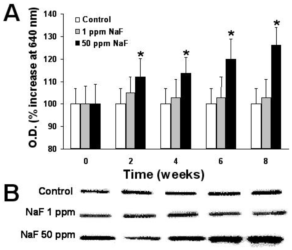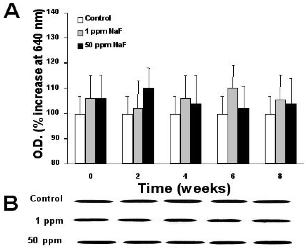 Time course of the expression of the bcl-2 protein on the leukocytes of rats treated with 1 or 50 parts per million (ppm) of sodium fluoride (NaF) for up to 8 weeks. (A). Western blots were scanned at 640 nm, and the relative amount of protein is expressed in absorbance units throughout the treatment time. Each point represents those scanned in duplicate of five rats expressed as percentage of control ± Standard error (SE). (B). a representative image of aWestern blot of the protein bcl-2.