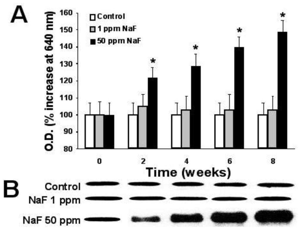 The animals were treated according to established protocols in which experimental animals are exposed to known concentrations of NaF, which is added to their drinking water [,], and changes were monitored each week for the time assigned by the protocol.