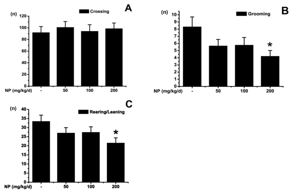 The locomotor and exploratory behavior of nonylphenol (NP) treated mice at different doses or vehicle (n = 9). All values are expressed as means ± S.E.M. (A) Comparison of crossing numbers (within 5 min); (B) Comparison of rearing/leaning numbers (within 5 min); (C) Comparison of grooming numbers (within 5 min). * p < 0.05 vs. the vehicle control.