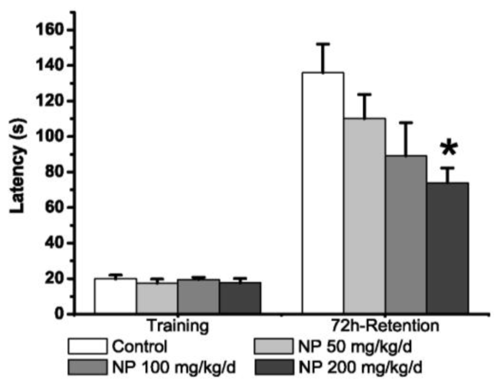 In the acquisition trial, the latencies for entry into the dark compartment did not differ significantly among groups (p > 0.05) (Figure 2). In the 72-hour-retention trial, the latencies in mice treated with NP at 200 mg kg−1 d−1 were significantly decreased (p < 0.05), but the decrease was not significant in the groups at 50 and 100 mg kg−1 d−1 compared with the control group (p > 0.05).