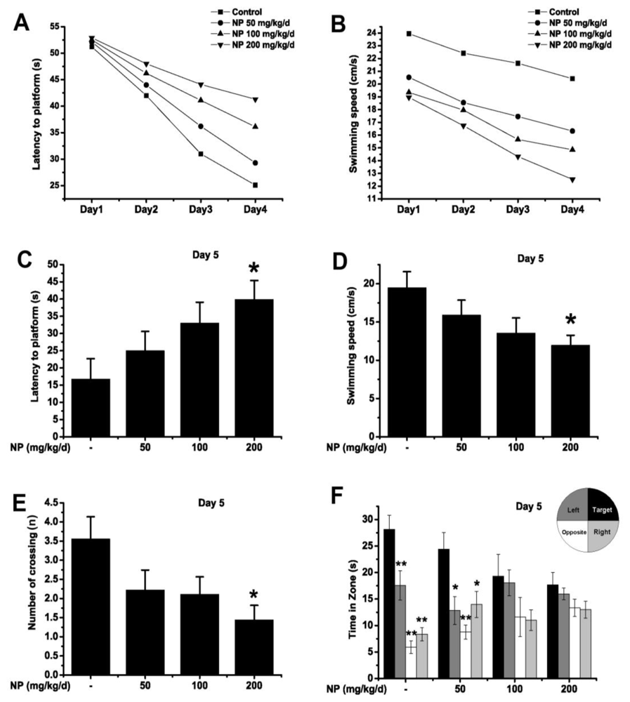 On Day 5, latency, swimming speed, the number of times crossing over the platform site and the time spent in four quadrants were measured for all groups. The NP-treated mice (at the dose of 200 mg kg−1 d−1) had longer latencies (p < 0.05) and a slower swimming speed (p < 0.05) compared with the control (Figures 3C and 3D). In the probe trial, the NP (200 mg kg−1 d−1) treated group made fewer platform crossings than the control group (p < 0.05) (Figure 3E). Both 50 mg kg−1 d−1 NP-treated and control mice spent most of their time in the target quadrant where the platform had been located during the training (Figure 3F).On the other hand, the groups treated with 100 and 200 mg kg−1 d−1 NP showed a decreased spatial preference for the target quadrant as compared with the control. All results revealed that NP at a higher dose (200 mg kg−1 d−1) could impair the ability of spatial learning and memory as well as the locomotor activity of mice.