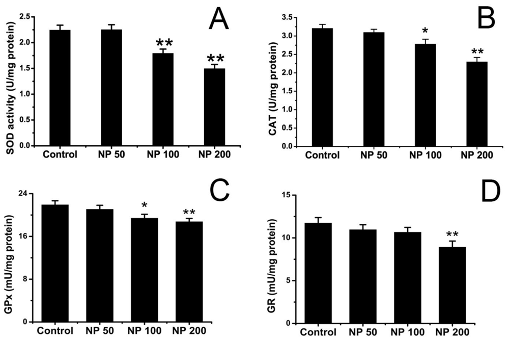 The effect of NP on SOD (A), CAT (B), GPx (C) and GR (D) activity in mouse brain (n = 9). Values are expressed as mean ± S.E.M. * p < 0.05; ** p < 0.01 vs. the vehicle control.