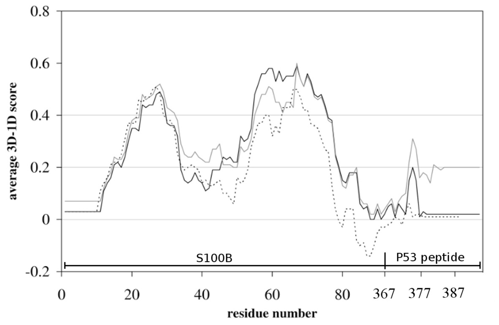 VERIFY-3D plots of molecular complexes of WT (black continuous line) and G389E (grey line) p53 peptide bound to S100B compared to the starting NMR structure 1DT7 (black dashed line). Although a negative score region is present in the template structure, the modeled structural motifs are characterized by the absence of negative score regions in the plots. Residues are numbered consecutively by VERIFY-3D from the amino terminus of S100B.