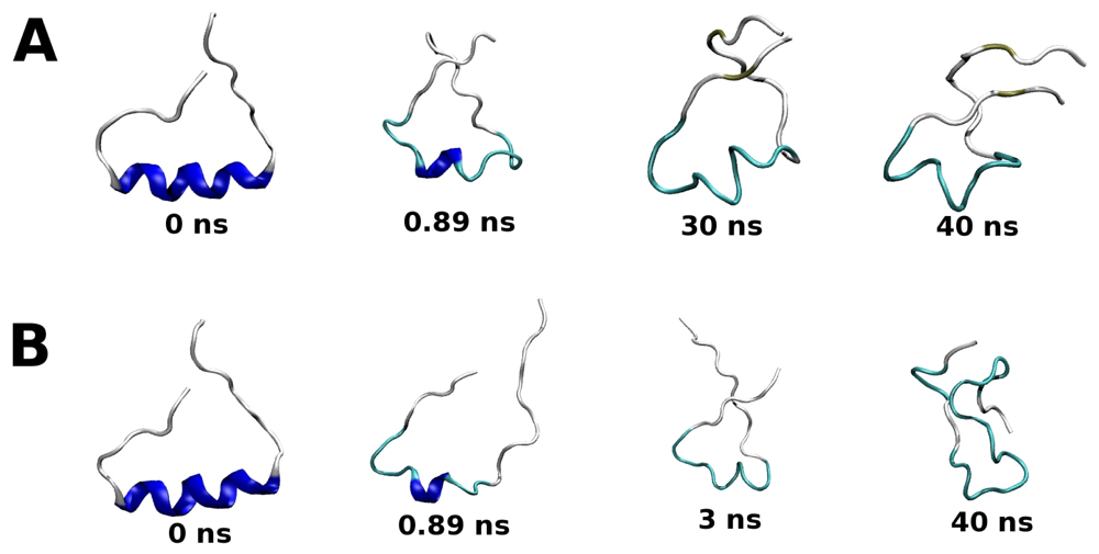 Representative snapshots taken from the 40 ns simulations of WT (A) and G389E (B) p53 extreme C-terminus domain free in solution.