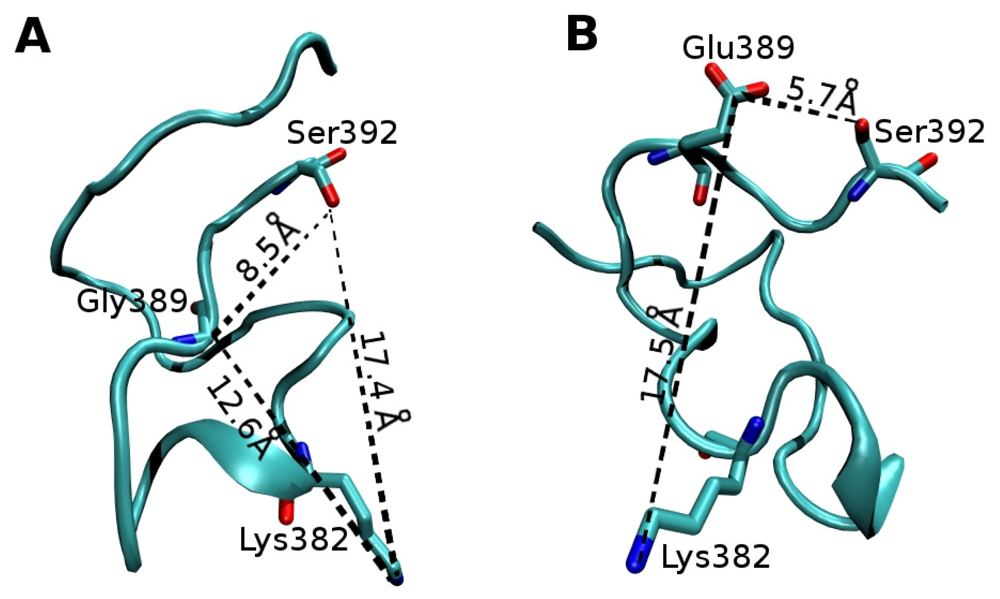 The figure displays the distances of Glu389 residue from Lys382 and Ser392, and highlights the negligible effect exerted by position 389 on the main acetylation and phosphorylation sites at the C-terminus of p53 []. Analysis of MD trajectories indicates that during the entire 40 ns of simulation, Glu389 is solvent exposed and does not interact with other residues of the extreme CTD.