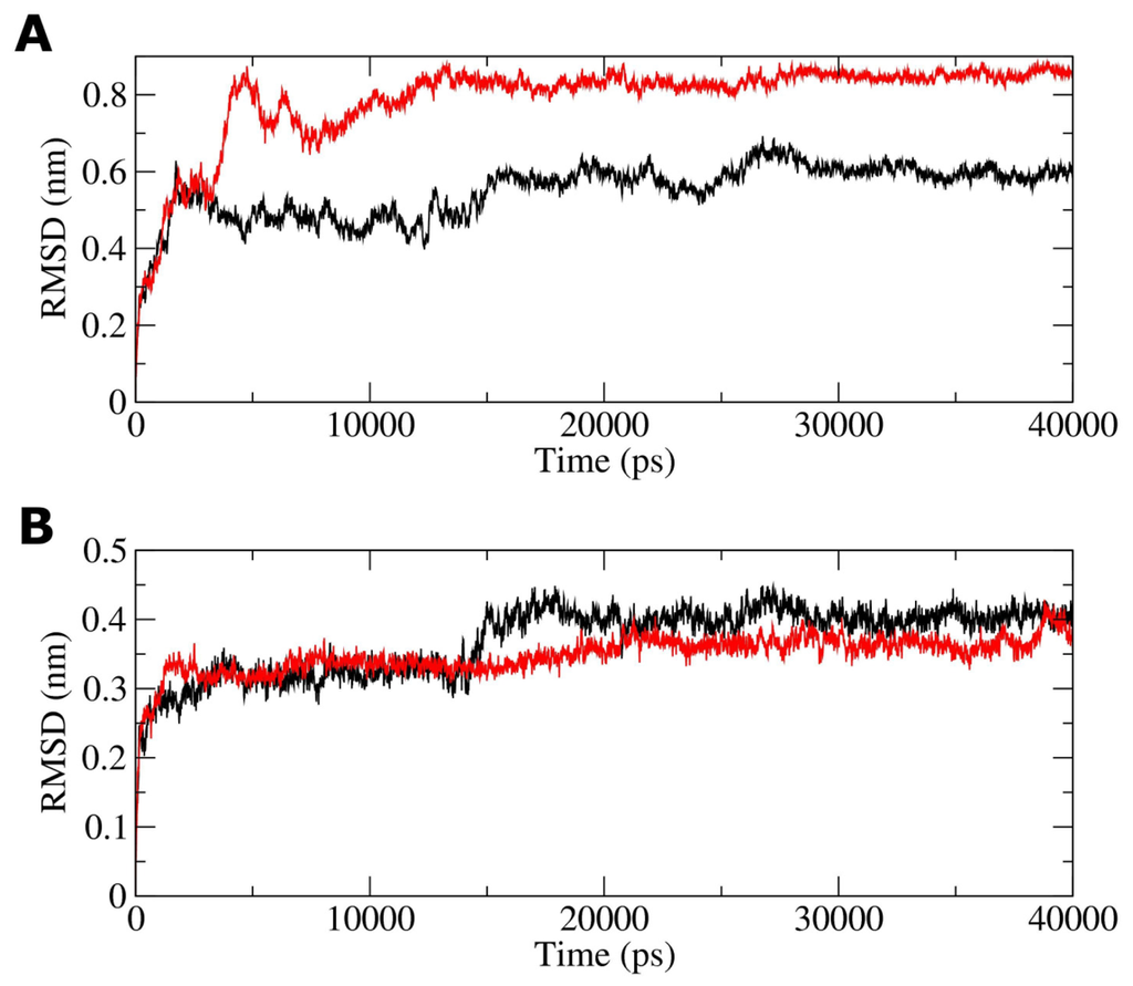 RMSD plots of S100B complexes throughout the MD simulations. (A) Backbone atom RMSD with WT (black) and G389E (red) peptide of p53 included; (B) Backbone atom RMSD with WT (black) and G389E (red) peptide of p53 excluded.