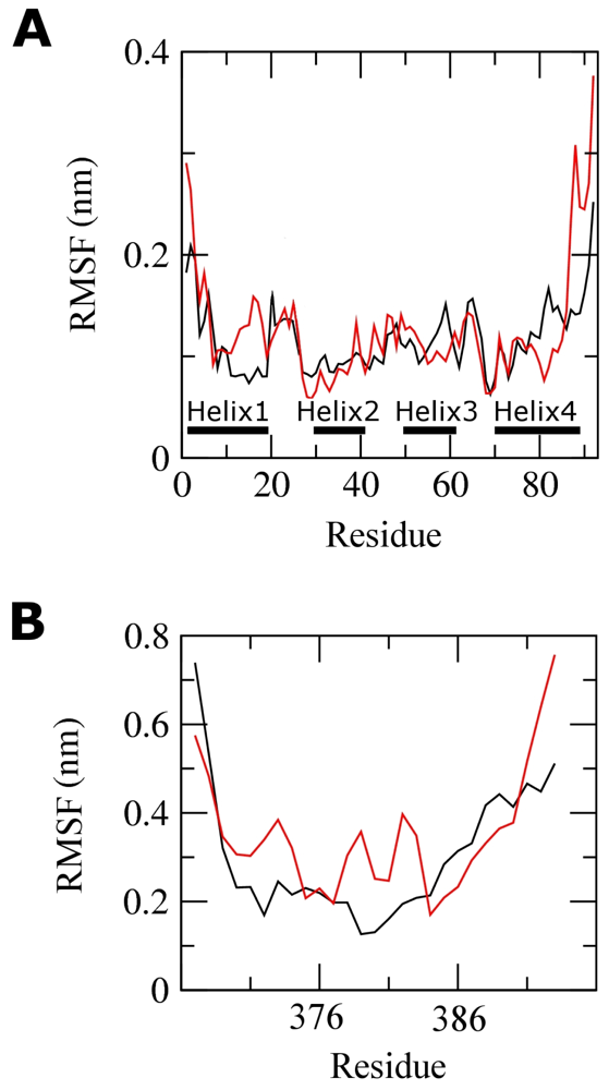 The deviations described above indicate how far the protein has moved from the starting structure. The Cα root-mean-square fluctuations (RMSF) with respect to the average MD conformation are extremely appropriate to describe flexibility differences among residues (Figure 6).