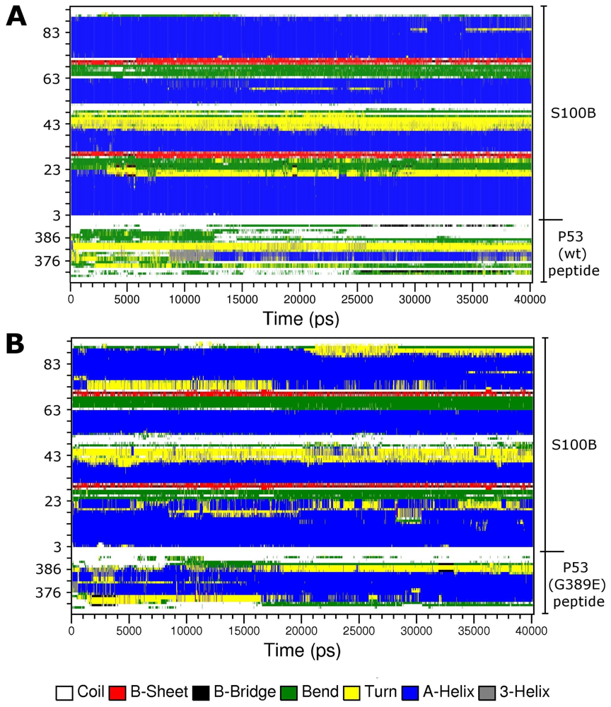 Secondary structure of S100B complexes as a function of time. Results for WT peptide- and G389E peptide-S100B complexes are reported in (A) and (B), respectively.