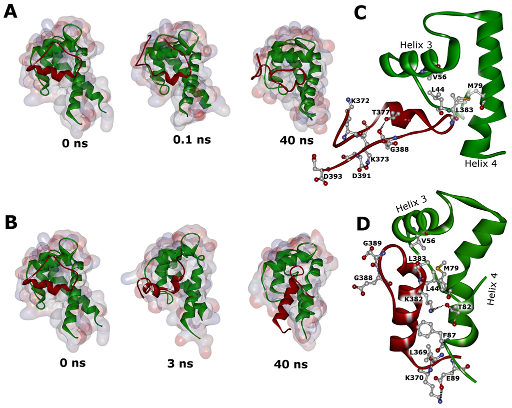 Snapshots from the simulated complexes during the MD runs. Plots of WT (A) and G389E (B) complex intermediates generated by the MD simulation at the indicated times. S100B and p53 peptides are represented by green and red cartoons, respectively. The loss of secondary structure in the WT peptide (A) and the movement of the helix in the G389E peptide (B), as a function of time, are noteworthy. Average structures over the last 5 ns of simulation of the WT and G389E complexes are reported in panel (C) and (D), respectively.