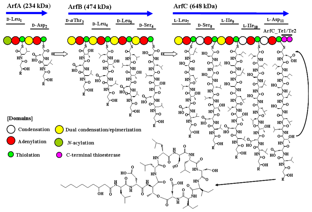 Fengycin, also referred to as plipastatin when Tyr3 and Tyr9 is present as the l-and d-form, repectively. It is an anti-fungal antibiotic that inhibits filamentous fungi but is ineffective against yeast and bacteria. It is also capable of inhibiting phospholipase A2 and biofilm formation of several bacteria [4,37,77,78]. These types of lipodecapeptides are produced by various strains of Bacillus spp. and exhibit moderate surfactant activities [4,17,79]. Fengycin is expected to form a lactone between the hydroxyl group of l-Tyr3 and the C-terminal carboxyl group of l-Ile. Fengycin synthetase (Fen) contains five NRPS subunits: FenC (287 kDa), FenD (290 kDa), FenE (286 kDa), FenA (406 kDa), and FenB (146 kDa). Like SrfA and Lic, Fen is also composed of an N-acyl domain at the N-terminus of FenC, conventional E-domains, and a typical type I Te-domain. Fen assembles to form a co-linear chain ordered as FenC-Fend-FenE-FenA-FenB [80].