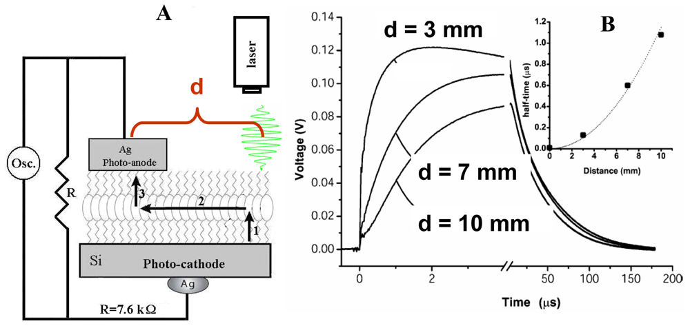 Here we show that the charge displacement perpendicular to the surface is sufficiently strong for direct measurements. To pick this electrostatic signature, we utilize an auxiliary transparent electrode that acts as a capacitive probe (Figure 12). This probe, proposed by Bergmann in 1932, selectively picks the ac voltage [87]. Previously, the transparent auxiliary electrode has been used to study the photovoltage generated by the p-n junctions. This nondestructive no contact method proved to be convenient for the quality control of these junctions before and without equipping them with electrodes [87,88] or for measurement of the lifetimes of the minority charge carriers [89,90]. In those measurements, the ac photovoltage has been generated by a chopped light beam and its amplitude has been measured. While repetitive laser represents a limit case of the chopped beam, application of short pulses permits time-resolved measurements. Interestingly, a related approach has been utilized in the studies of the photosynthetic reaction centers in the essentially 3D membrane suspension samples [91,92].