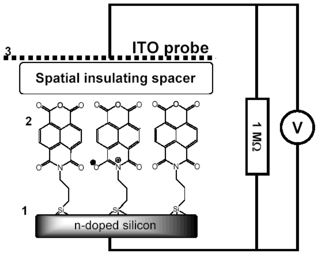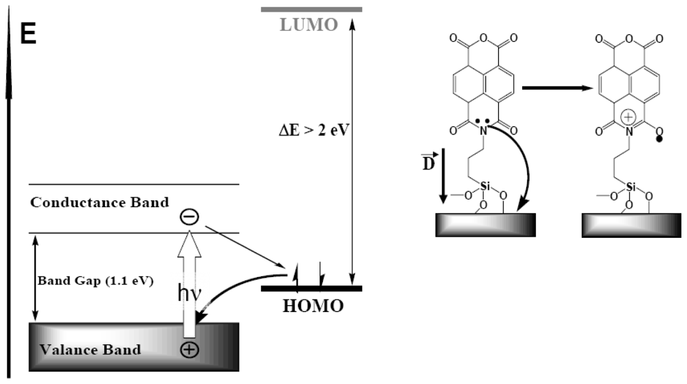 When redox active molecules are covalently tethered to the surface of the n-doped silicon, light induces their oxidation by the semiconductor (see Section 2.1). One particular problem to be solved by the new method originates from our abovementioned results. In principle, the energy can be conserved for further spatial transfer in two ways. First, it can be converted into the energy of the excited state as in the photosynthetic light harvesting antennas. Second, similarly to the dye-sensitized cells, the energy can be conserved as the free energy of charge back recombination (Figures 15 and 16). In the second case, the actual case as we show, the role of the organic molecules in these SAM-PVCs is different from the role of the dye in the dye sensitized cells. The NTCDI molecules do not absorb light but act exclusively as redox couplers and form cation-radicals upon ejection of an electron into the light-induced hole in the valence band of silicon. However, distinguishing between the two possible mechanisms is challenging because adoption of the traditional methods used for the dyes-sensitized cells would make the endeavor prohibitively difficult. Switching to the IR region where silicon is transparent is demanding in terms of the equipment and still cannot help the fact that, the monolayers contain too few molecules for time-resolved spectroscopy and only a small fraction of these molecules actually forms radicals. These molecules react too fast to make single molecule techniques applicable even in principle. Finally, an attempt to produce model nanoparticles would require an adequate adaptation of the existing modification technology and there is now guarantee for the adequacy of the model system studied in the solution compared to the actual element functions in the solid state.