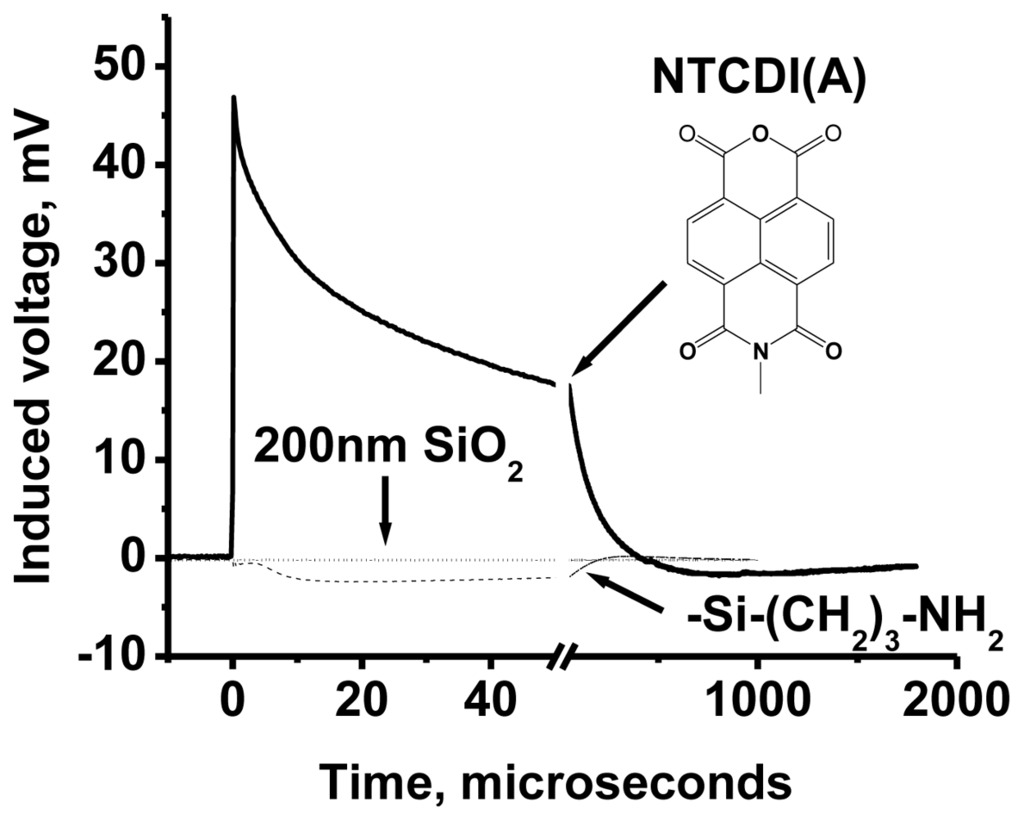 Therefore, the purpose of our study became two-fold. The first goal was to find a universal and highly sensitive method to study interfacial charge transfer. The second goal was to prove that illumination of the NTCDI-modified surface of silicon results in formation of cation-radicals at the junction and thus to test the potential of the method. In order to match these goals we have opted to the surface photovoltage technique, which is sensitive to the net charge displacement [85,86], the very basic property of redox reactions. Since the spatially organized charge transfer inevitably causes electric displacement perpendicular to the junction (Figure 11), we have expected this elegant non-spectroscopic approach to be extremely useful in the studies of the surface redox chemistry.