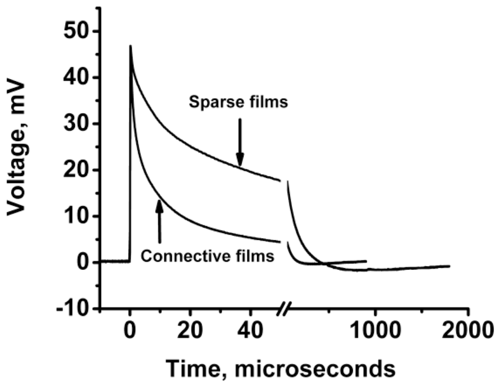 These were performed with a picosecond laser system consisting of a Ti: Sapphire femtosecond laser, stretcher/compressor/amplifier of picosecond laser pulse (“Titan”, Quantronix), and optical parametric amplifier of superflourescense (“TOPAS”, Qunantronix/Light Conversion). The output pulse parameters were: wavelength 532 nm, energy 10 μJ, pulse duration 1 ps, and repetition rate 1 kHz. To avoid saturation effects, the pulse energy was attenuated to a 0.1 μJ level with a beam diameter of 1 mm. The photovoltage transients were recorded by Tektronix TDS 3025 digital oscilloscope bypassed with a 7.6 kΩ resistor (Figure 3).