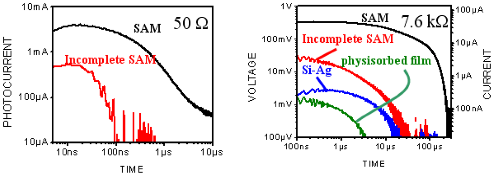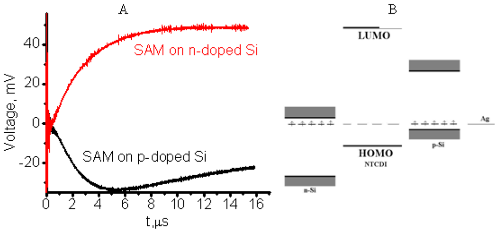 To achieve hybrid SAM-PVC, we self-assemble the NTCDA molecules, which are the same molecules used in the conductive channel of SAM-OFET, on n-type silicon substrate. The self-assembly strategy followed step-A synthetic protocol (Figure 1A). Two kind of measurement set up were used to evaluate transport in NTCDI-based SAM-PVC. The first measurement scheme relies on closed and second on open electrical circuit measurements. In the first set up, the Ag upper electrode was used to collect photocurrects. Semi-transparent ITO electrode was used to probe electric field created by photogenerated charges in the second set up. Combination of these measurements should (I) provide a kinetic of charge transfer in 2D NTCDI molecular system and (II) prove that this charge dynamic solely attributed to transport properties of 2D NTCDI molecular system, and not to capacitor discharge and interface charge transfer at SAM-PVC. The following section demonstrates the possibility to change the type of conductivity in 2D NTCDI molecular systems by changing substrate type from traditional n-type Si to p-type Si substrate.