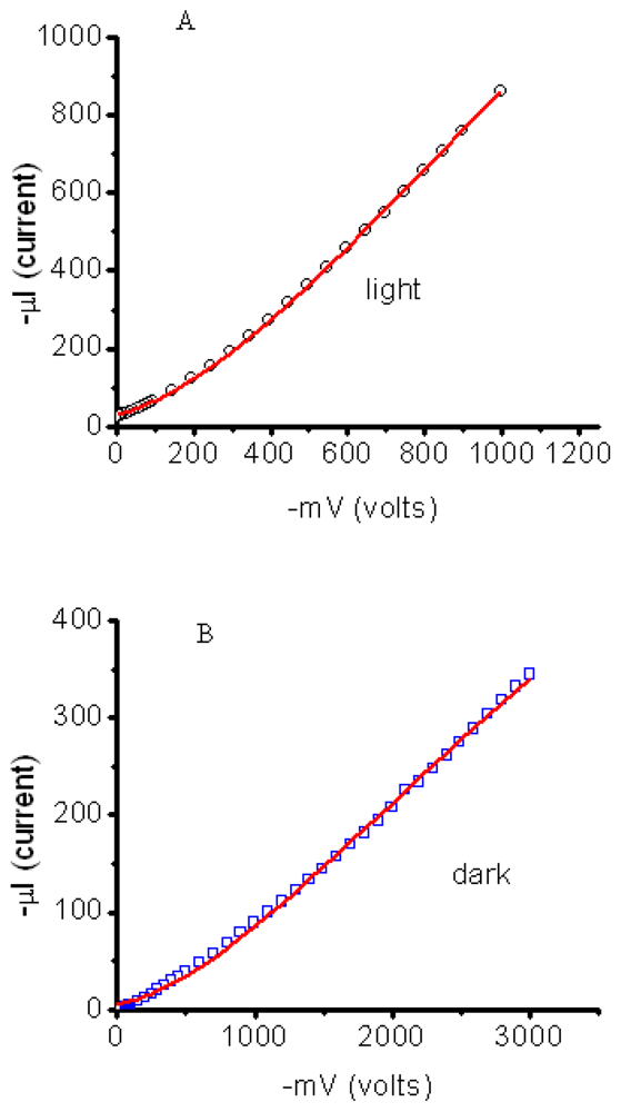 Electrooptical properties of the Si/NTCDI/Ag heterostructure. All experiments have been carried out at room temperature. Constant monochromatic 400 nm light illuminated a ~10 mm spot centered ~5 mm away from the silver electrode. When the Ag electrode is highly electronegative, the element behaves as a photoamplifier and light noticeably increases the asymmetry of the I–V curve. The marked “Fitted area” will be used to model transport mechanism in SAM NTCDI channel.