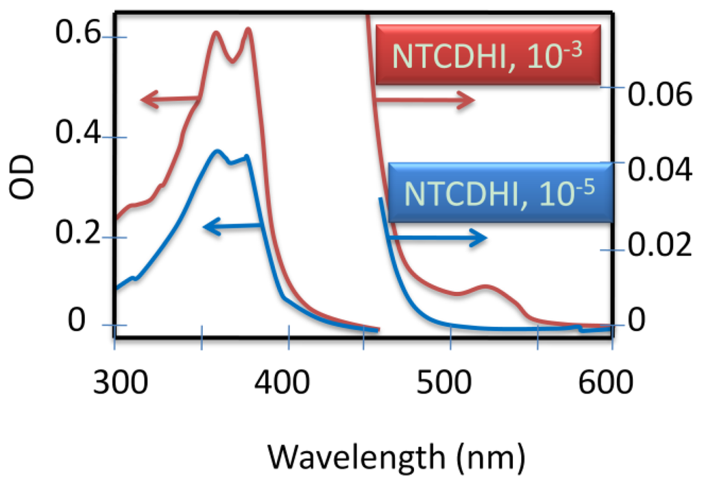 - Lee, Y-L; Hsu, H-L; Chen, S-Y; Yew, T-R. Solution-Processed Naphthalene Diimide Derivatives as n-Type Semiconductor Materials. J. Phys. Chem C 2008, 112, 1694–1699. [Google Scholar]