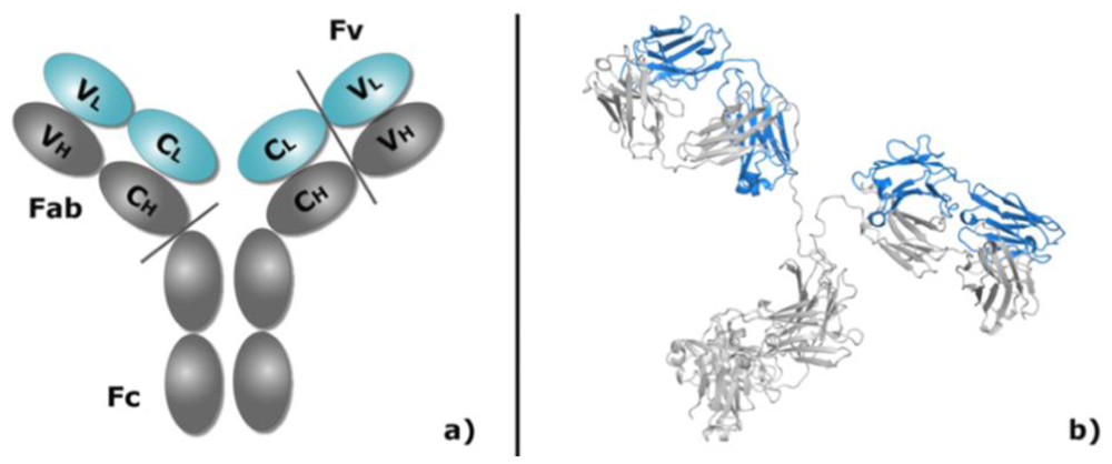 Schematic (a) and cartoon (b) representation of a full antibody structure. Antigens bind to the tip of the VH and VL domains.