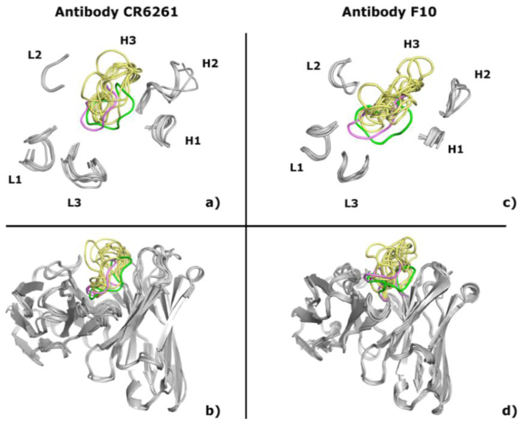 Cartoon representation of antibodies CR6261 (left) and F10 (right). Only the CDR loops are shown at the top, not drawn to scale. The H3 loop is colored green for the X-ray structure, violet for the best PIGS model and yellow for the Rosetta models.