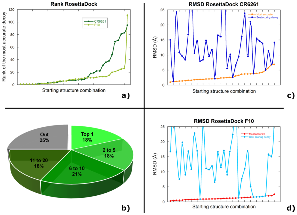 (a) Rank of the most accurate decoy (1 is the best scoring decoy, 2 the second best scoring and so forth) for each starting structure combination; (b) Rank of the most accurate decoy, presented as a percentage of all the possible starting combinations used; for example, the most accurate decoy is also the top scoring in 18% of the cases. RMSD (in Å) for the most accurate (orange and red) and best scoring (blue and cyan) decoy for CR6261 (c) and F10 (d). The best scorers are often considerably less accurate then the most accurate decoys, so choosing them as final docking solution would not be ideal. All data refer to the RosettaDock calculations.
