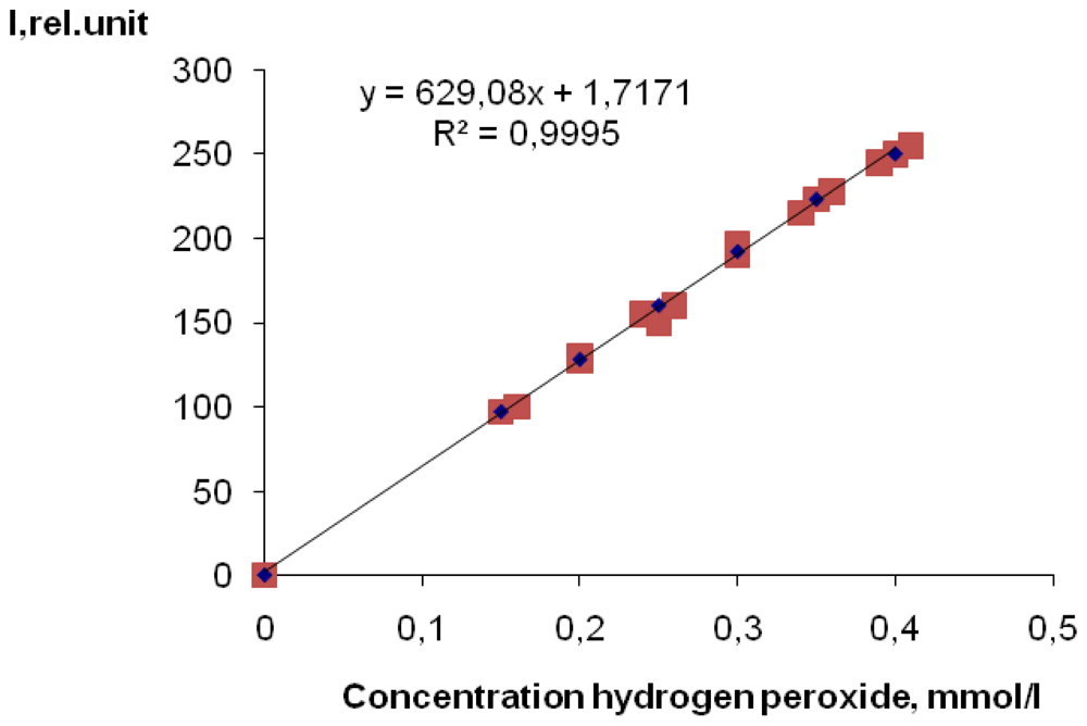 In Figure 1 the emission spectrum of the reaction product of terephthalic acid with OH• radicals (TA-OH) at λ = 327 nm (see Scheme 2) is presented. These data are in excellent agreement with those in []. In Figure 2, the dependence on the signal strength of TA-OH on hydrogen peroxide concentration (mmol/L) is presented. A linear dependence in the range of H2O2 concentrations from 0.1mmol/L to 0.5 mmol/L was observed (Figure 2). For each concentration the three samples of hydrogen peroxide were used to obtain each measure.