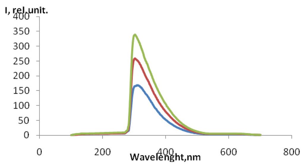 The fluorescence spectrum of TA-OH in human serum blood in patients with pathological schizophrenia at λ= 327 hm. ----0.1 mL of serum blood; ----0.2 mL of serum blood; ----0.25 mL of serum blood.