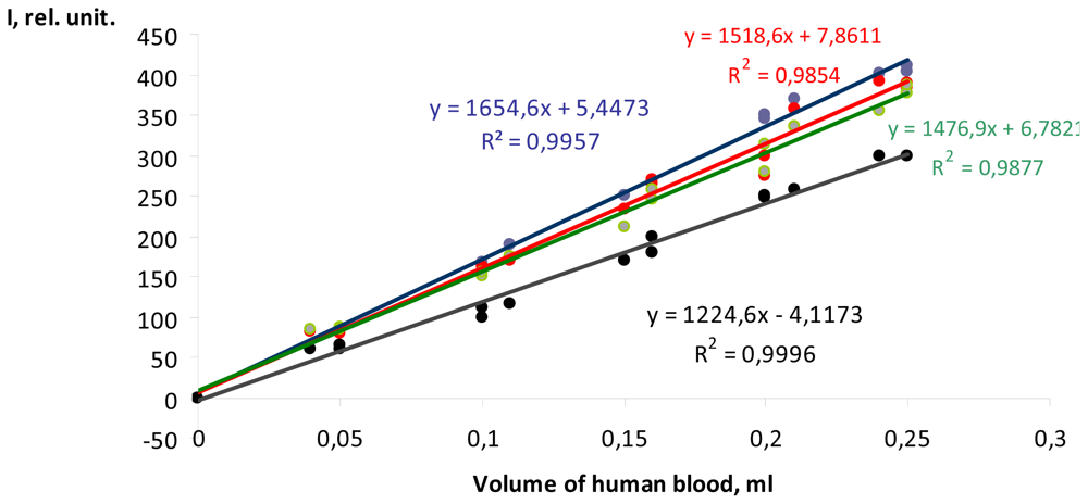 The results lead to the assumption that natural components of human serum blood contain a system able to generate active OH• radicals, which can be defined using fluorimetry. In turn, the controlling the maintenance of active OH• radicals in human serum blood will reveal the increase or decrease of ROS levels in the blood that can be key to understanding important biochemical processes developed in an organism with pathological symptoms of mental illnesses. In Figure 4 the dependence on the peak intensity of TA-OH fluorescence on the volume of added human serum blood, taken from healthy males and patients with pathological schizophrenia with an identical duration of the illness, is presented. All examples show a similar linear behavior. For each volume the three samples of human serum blood were used to obtain each measure.