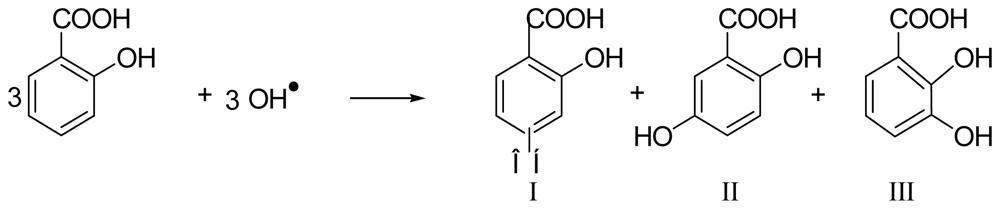 It is known that reactive oxygen species (ROS) are involved in diseases like cancer, atherosclerosis, hepatocirrhosis, psychotropic diseases, etc. Direct detection of ROS is practically impossible because of their extreme reactivity and very short lifetime. This led to the development of chemical traps to facilitate their quantitative detection [], where the potential of ROS to oxidize a chemical trap is defined as Fenton activity. The most commonly used procedure is based on the hydroxylation of salicylic acid, which is based on the chemical reaction shown in Scheme 1: