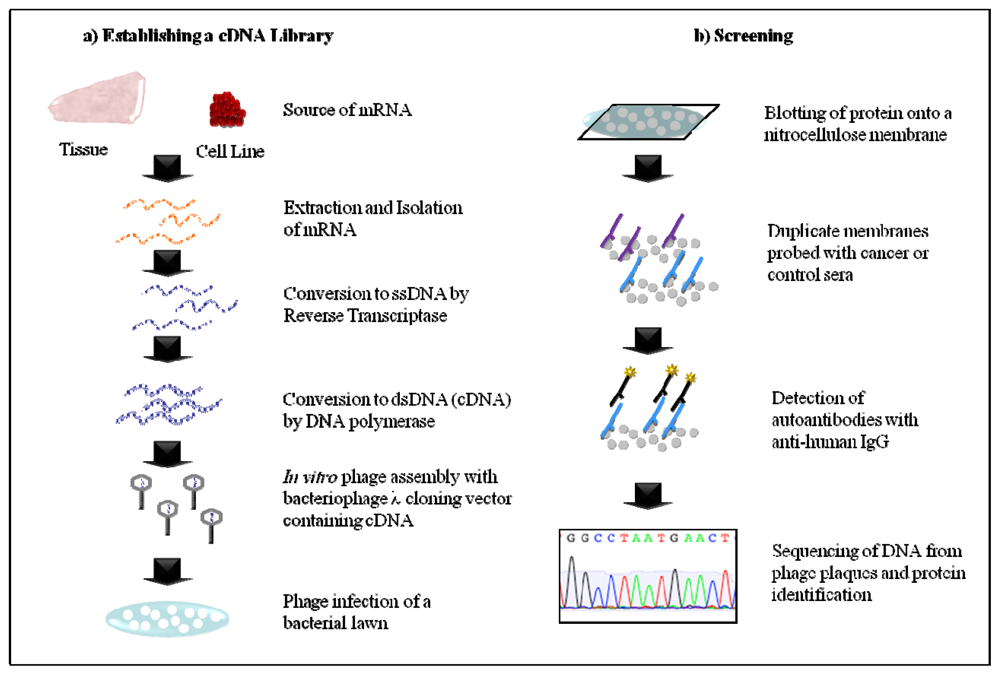 Schematic outlining autoantibody identification by SEREX. (a) mRNA extracted from cancer tissue or cell line is converted to cDNA prior to cloning into a phage vector, which is packaged into phage virions and expressed during bacterial infection; (b) Proteins generated during lytic infection are blotted onto a membrane and probed with sera. Upon detection of cancer specific autoantibody signals phage DNA is sequenced and TAA identified through a database search.