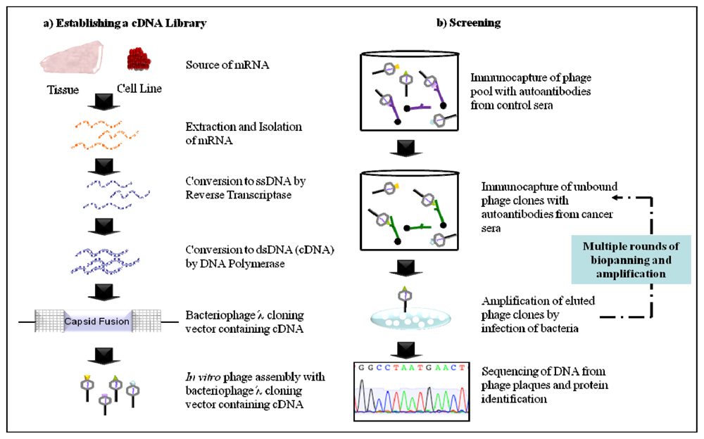 Schematic outlining autoantibody identification by phage display. (a) mRNA extracted from cancer tissue or cell line is converted to cDNA. Phage vectors encoding human cDNA sequences are assembled into virions for expression as recombinant capsid fusion proteins; (b) Phage clones presenting immunoreactive peptides are immunoprecipitated from the pool with antibodies from the sera of healthy individuals. Unbound clones are immunoprecipitated with antibodies from the sera of cancer patients, eluted and amplified through infection of E. coli. Phage clones isolated by multiple rounds of immunoprecipitation with antibodies from cancerous sera are then sequenced and antigenic proteins identified.