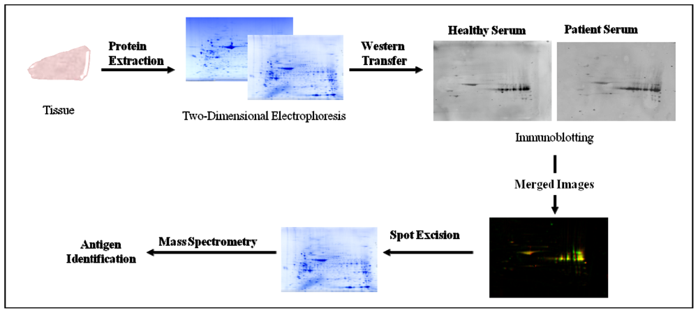 Proteins and peptides isolated from cancer cell lines or tumour tissue are separated by 2-DE, electrophoretically transferred onto a membrane and subsequently probed with patient or control sera for biomarker discovery and validation. Autoantibodies bound to antigens can then be detected by probing the membrane with a secondary antibody that is raised against the fragment crystallisable (Fc) region of human IgG. The secondary antibody is typically linked to an enzyme, such as horse radish peroxidase (HRP), which catalyses a chemoluminescent reaction in the presence of substrate that can be visualised on X-ray film. Alternatively, the secondary antibody may be conjugated to a detectable fluorescent tag (Cy5, Cy3, etc.) that can be visualised by scanning of the membrane with a fluorescence scanner. Seroreactive proteins specific to cancer can then be identified by mass spectrometry (MS).
