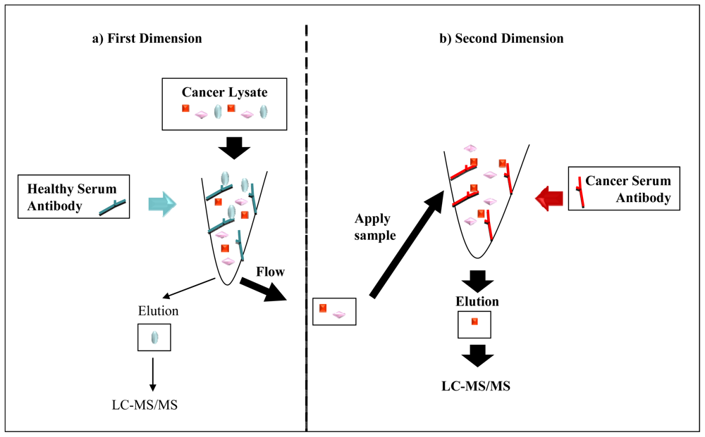 Purification of TAAs from cancer tissue lysates using two dimensional affinity chromatography. (a) Autoantigens that are not specific to cancer (blue circles) are captured in the first dimension by autoantibodies from healthy subjects; (b) Proteins that are not captured in the first dimension (flow through; square and diamond) are subjected to the second dimension where cancer specific TAAs will be captured (square) by autoantibodies from cancer patients. The subsequent elution fractions from both columns are assessed by LC-MS/MS. LC: liquid chromatography; MS: mass spectrometry.