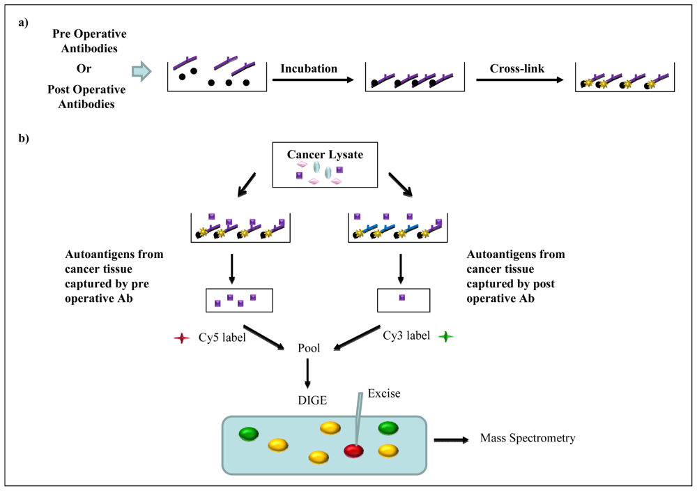 In a different approach, Gagnon and colleagues [30] used pre and post operative sera from ovarian cancer patients to identify autoantibodies whose concentration decline after treatment, reflecting decreased tumour load, and therefore potentially having diagnostic value. Firstly, antigens present in the cancer tissue lysates were immunoprecipitated with plasma antibodies from the same patient that were chemically cross-linked to protein-G sepharose beads (Figure 7a). Eluted fractions were then fluorescently labelled and subjected to differential gel electrophoresis (DIGE) analysis (Figure 7b). Autoantigens that were present at a higher intensity in pre operative samples than post operative samples on the DIGE gel were indicative of a change in autoantibody response due to treatment. By means of a two-dimensional differential gel electrophoresis analysis of immuno-precipitated tumour antigens (2D-DITA) Gagnon et al. identified autoantigen S100A7 to have the greatest differential signal [30].